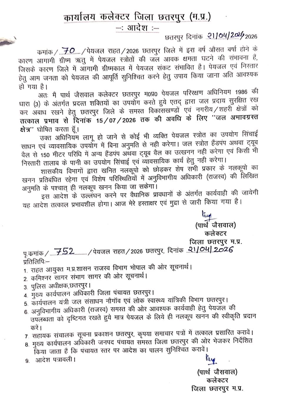 छतरपुर में संभावित जल संकट को देखते हुए जिला प्रशासन ने बड़ा कदम उठाया है। कलेक्टर पार्थ जैसवाल ने पूरे जिले को 15 जुलाई 2026 तक जल अभावग्रस्त क्षेत्र घोषित कर दिया है। यह निर्णय ग्रीष्म ऋतु में घटती जल उपलब्धता और पेयजल संकट की आशंका को ध्यान में रखते हुए लिया गया है, ताकि आम जनता को पर्याप्त पानी मिल सके।