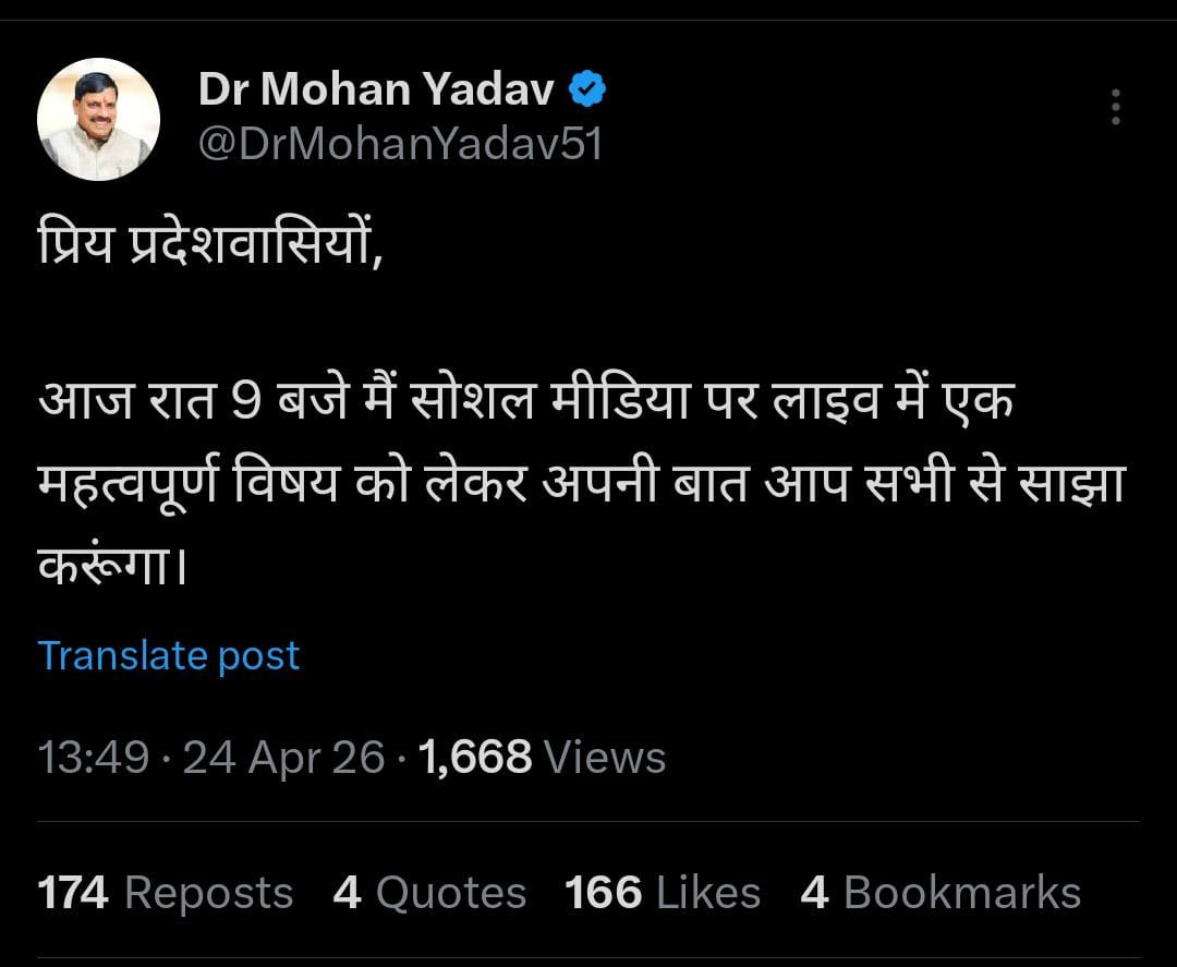 डॉ. मोहन यादव ने सोशल मीडिया पर पोस्ट कर जानकारी दी – “प्रिय प्रदेशवासियों, आज रात 9 बजे मै सोशल मीडिया पर लाइव में एक महत्वपूर्ण विषय को लेकर अपनी बात सभी से साझा करूंगा”