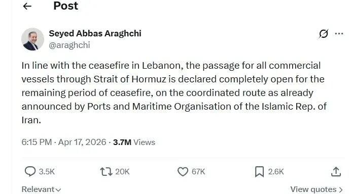 ईरान ने स्पष्ट किया है कि यह निर्णय लेबनान में लागू सीजफायर के तहत लिया गया है। विदेश मंत्री अराघची ने सोशल मीडिया पर कहा कि सभी कमर्शियल जहाजों को पहले से तय किए गए समन्वित रूट के जरिए गुजरने की अनुमति होगी। मतलब यह है कि यह पूरी तरह “खुला” होने के बावजूद एक नियंत्रित व्यवस्था के तहत संचालित होगा।