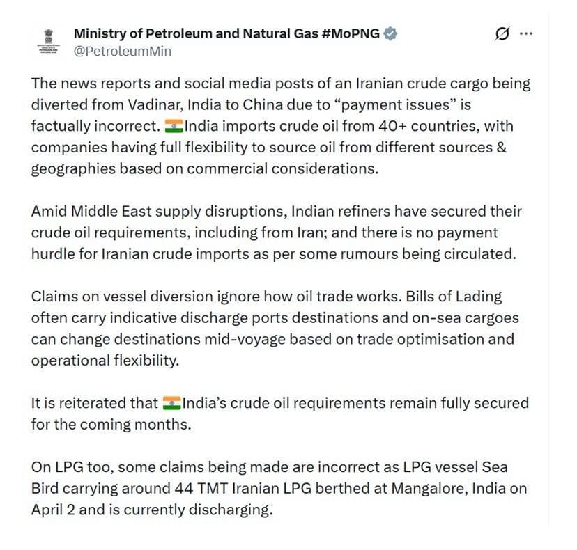 मंत्रालय के बयान के अनुसार, भारत 40 से अधिक देशों से कच्चा तेल आयात करता है और तेल कंपनियों को व्यावसायिक परिस्थितियों के आधार पर विभिन्न स्रोतों से तेल खरीदने की पूरी स्वतंत्रता है। साथ ही यह भी स्पष्ट किया गया कि भारत की कच्चे तेल की जरूरतें आने वाले महीनों के लिए पूरी तरह सुरक्षित हैं।