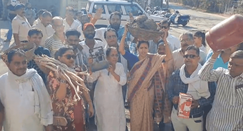 खंडवा: महंगाई के खिलाफ कांग्रेस का हल्लाबोल प्रदर्शन; कंडे और कोयला लेकर पहुंचे कलेक्ट्रेट