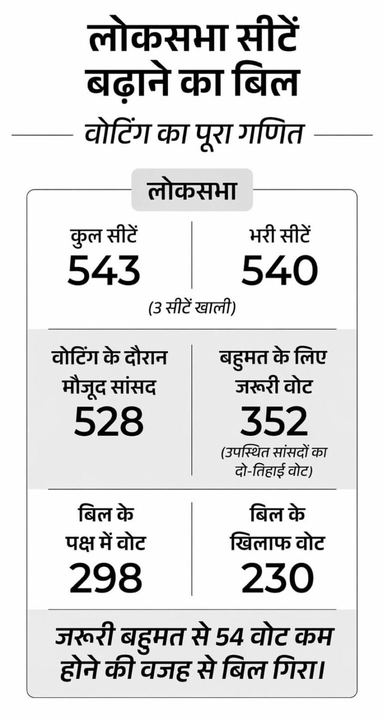 लोकसभा में कुल 528 सांसदों ने वोटिंग में हिस्सा लिया। संविधान संशोधन बिल पास करने के लिए उपस्थित और मतदान करने वाले सदस्यों के दो-तिहाई यानी 352 वोट जरूरी थे। लेकिन सरकार को केवल 298 वोट ही मिले, जबकि 230 सांसदों ने विरोध में वोट किया। यानी सरकार बहुमत होने के बावजूद विशेष बहुमत जुटाने में नाकाम रही और बिल 54 वोट से गिर गया।