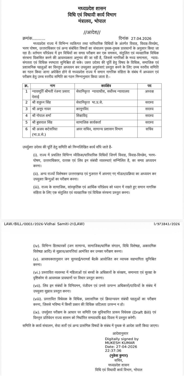 भोपाल/आदित्य शंकर तिवारी:   मध्य प्रदेश सरकार ने समान नागरिक संहिता के संबंध में अध्ययन और प्रशिक्षण के लिए उच्च स्तरीय समिति का गठन किया है। यह समिति विभिन्न कानूनी, सामाजिक और प्रशासनिक पहलुओं का अध्ययन कर सरकार को सुझाव देगी।