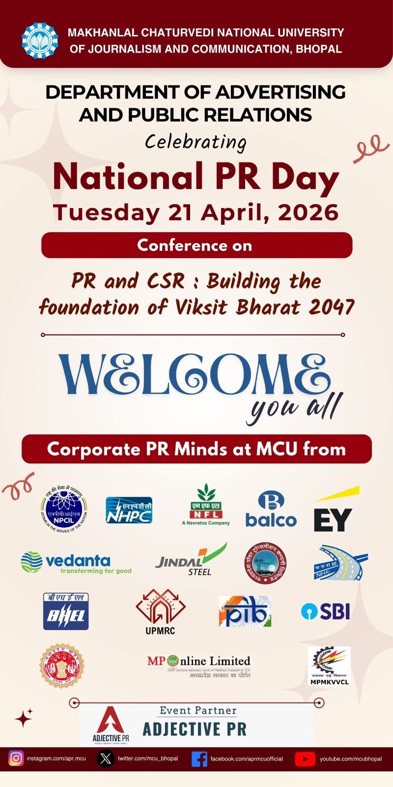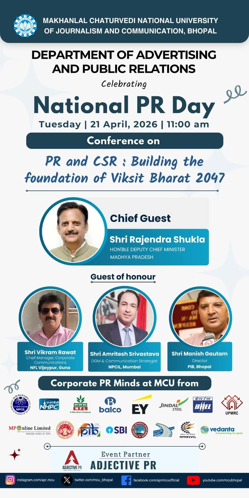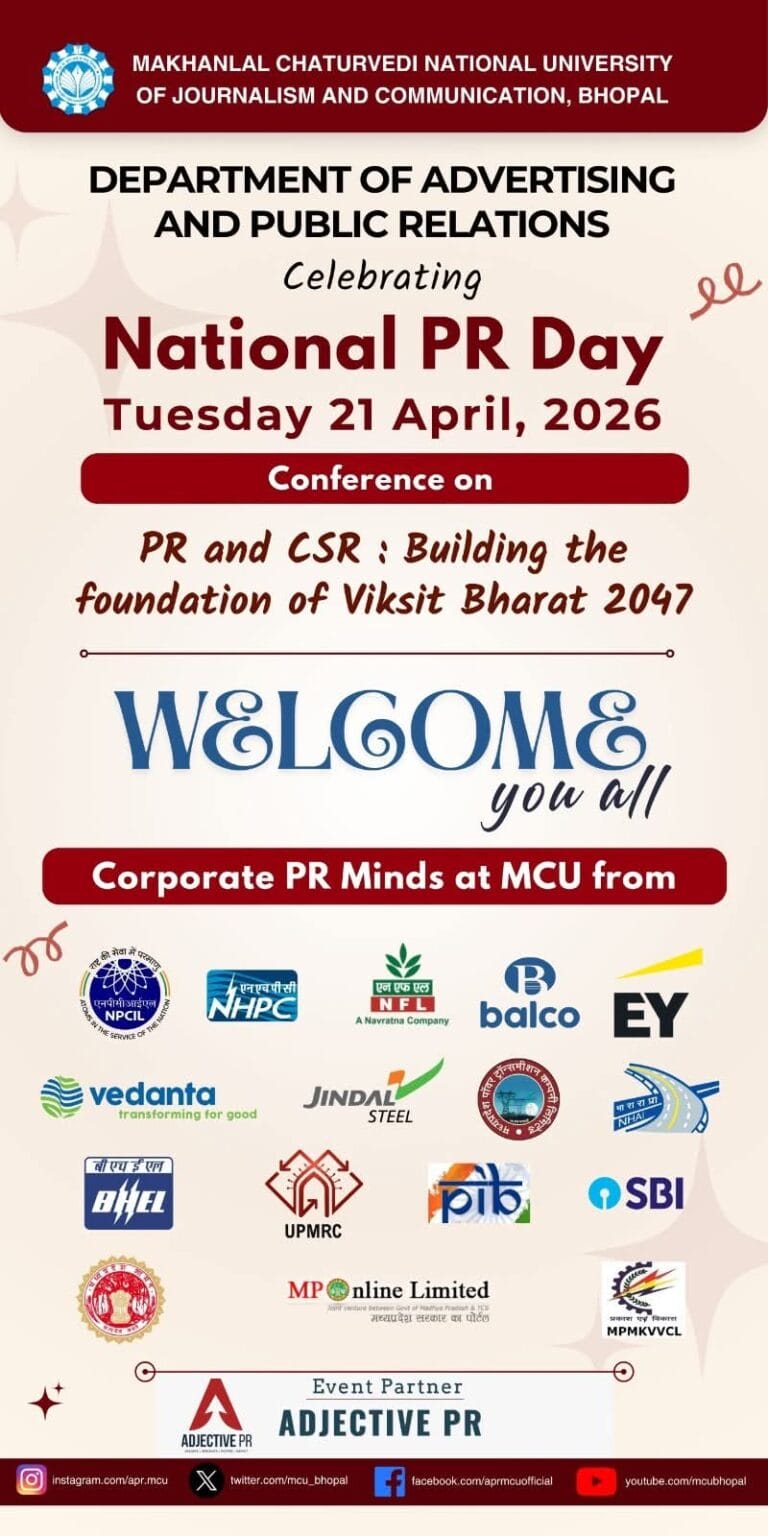 भोपाल/आदित्य शंकर तिवारी: माखनलाल चतुर्वेदी राष्ट्रीय पत्रकारिता एवं संचार विश्वविद्यालय भोपाल के विज्ञापन एवं जनसंपर्क विभाग द्वारा 21 अप्रैल को राष्ट्रीय जनसंपर्क दिवस के अवसर पर “पीआर एंड सीएसआर बिल्डिंग द फाउंडेशन ऑफ विकसित भारत 2047” विषयक संगोष्ठी का आयोजन किया जा रहा है। इसमें देशभर से कॉर्पोरेट सेक्टर से कम्युनिकेशन फील्ड के टॉप प्रबंधक सम्मिलित होंगे। यह कार्यक्रम सीएसआर तथा जनसंपर्क की भूमिका पर केंद्रित होगा। यह कार्यक्रम मंगलवार 21 अप्रैल 2026 को विश्वविद्यालय के बिशनखेड़ी परिसर के तक्षशिला परिसर स्थित लता मंगेशकर सभागार में प्रातः 11 बजे आयोजित होगा।