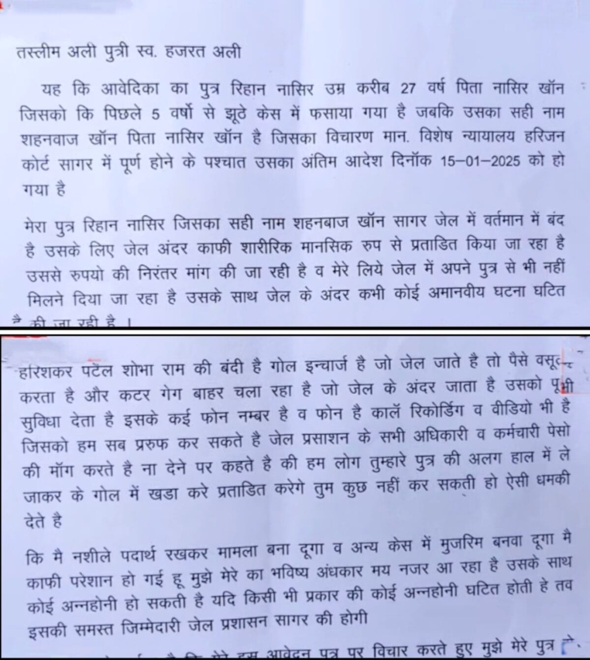 महिला ने जेल प्रशासन पर गंभीर आरोप लगाए हैं। उनका कहना है कि उनसे अवैध वसूली की गई, पैसे न देने पर बेटे को मानसिक और शारीरिक प्रताड़ना दी गई, और अदालती आदेश की अनदेखी की गई, जबकि हरिजन कोर्ट का अंतिम आदेश 15 जनवरी 2025 को आ चुका था। महिला ने चेतावनी दी कि अगर उसके बेटे के साथ जेल में कोई अनहोनी होती है, तो इसकी जिम्मेदारी जेल विभाग की होगी।