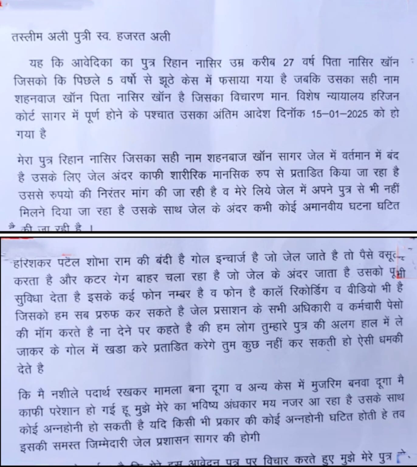 महिला का आरोप है कि उसका बेटा रेहान नासिर पिछले पांच वर्षों से हत्या के एक कथित झूठे मामले में सागर जेल में बंद है। महिला ने बताया कि पिछले छह-सात दिनों से वह अपने बेटे से मिलने की कोशिश कर रही थी, लेकिन जेल प्रशासन ने उसे मिलने की अनुमति नहीं दी। इसी हताशा में उसने कलेक्ट्रेट पहुंचकर आत्मघाती कदम उठाने की कोशिश की।