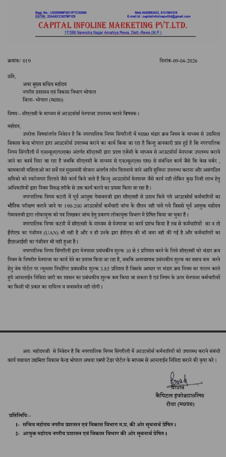 कटनी में इस कंपनी पर फर्जी हाजिरी और कर्मचारियों की संख्या बढ़ाकर भुगतान लेने के गंभीर आरोप लग चुके हैं। क्या सिंगरौली में भी जनता के टैक्स के पैसे को इसी तरह ठिकाने लगाने की योजना है?