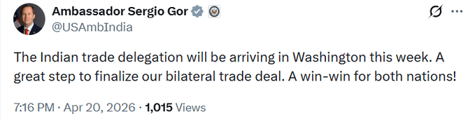 वॉशिंगटन डी.सी/यूएस: भारत और अमेरिका के बीच बहुप्रतिक्षित द्विपक्षीय व्यापार समझौते (द्विपक्षीय व्यापार समझौता) को अंतिम रूप देने की दिशा में महत्वपूर्ण प्रगति देखने को मिल रही है। भारत में अमेरिका के राजदूत सर्जियो गोर ने सोशल मीडिया प्लेटफॉर्म X (ट्विटर) पर जानकारी देते हुए कहा कि भारतीय व्यापार प्रतिनिधियों इस सप्ताह वाशिंगटन पहुंचने वाला है, जहां दोनों देशों के बीच व्यापार समझौते को आगे बढ़ाने और अंतिम रूप देने पर चर्चा होगी।